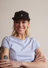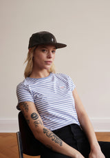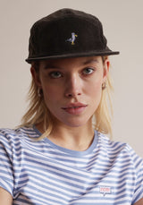 Das 5Panel Cap besteht aus feinem Bio-Cord. Hat einen geraden Schirm und um die Größe zu verstellen, ist hinten ein Riemen aus Metall zu finden.