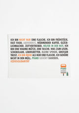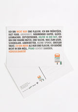 Bestellt werden können bis zu 150 Postkarten. Sollten größere Mengen benötigt werden, schreibt bitte eine E-Mail mit dem Betreff POSTKARTEN sowie einem kurzen Verwendungszweck an: info@pfand-gehoert-daneben.de - wir werden uns dann umgehend mit Euch in Verbindung setzen.