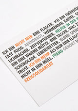 Preis inkl. MwSt. zzgl. VersandkostenDie A6 Postkarten (10,5 x 14,8 cm) bestehen aus 300g Recyclingpapier und sind klimaneutral gedruckt.